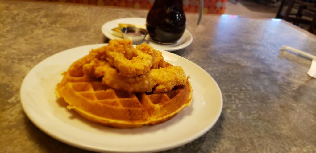 The waffles were delicious. I could not say the same for the unseasoned chicken tenders with no taste that sat on top of the waffle.