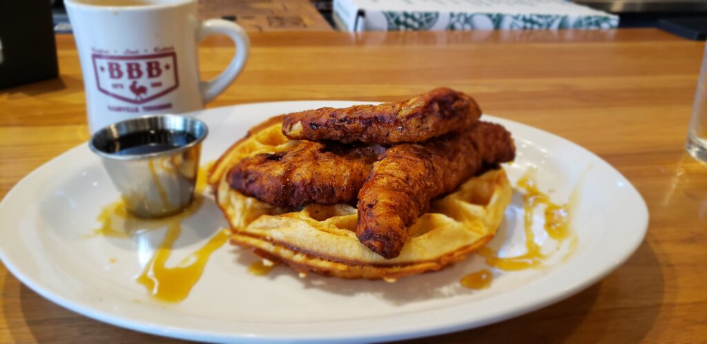 The chicken and waffles at BBB are simply delicious. The chicken was perfectly seasoned with a hint of spice and the perfectly cooked, soft but a little crisply waffle was divine. To top off the great tasting chicken and waffles was an amazing honey flavored BBB syrup that was simply perfection. The combination of the three put together has me wobbling out of the restaurant from being stuffed because I couldn’t and didn’t want to put my fork down.