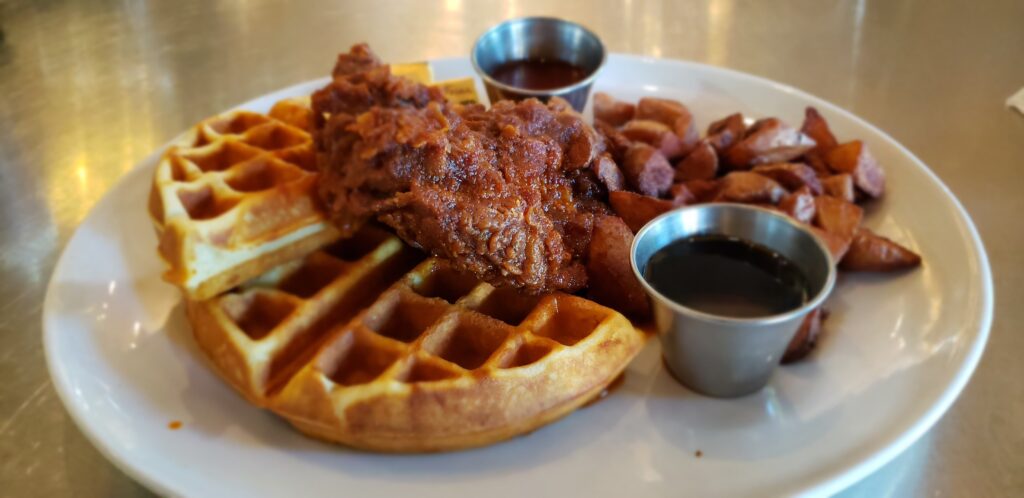 Offering two types of chicken and waffles on the menu—-Regular and “Nashville Hot” Chicken and Waffles. For my visit, I am going with the Nashville Hot Chicken and Waffles.