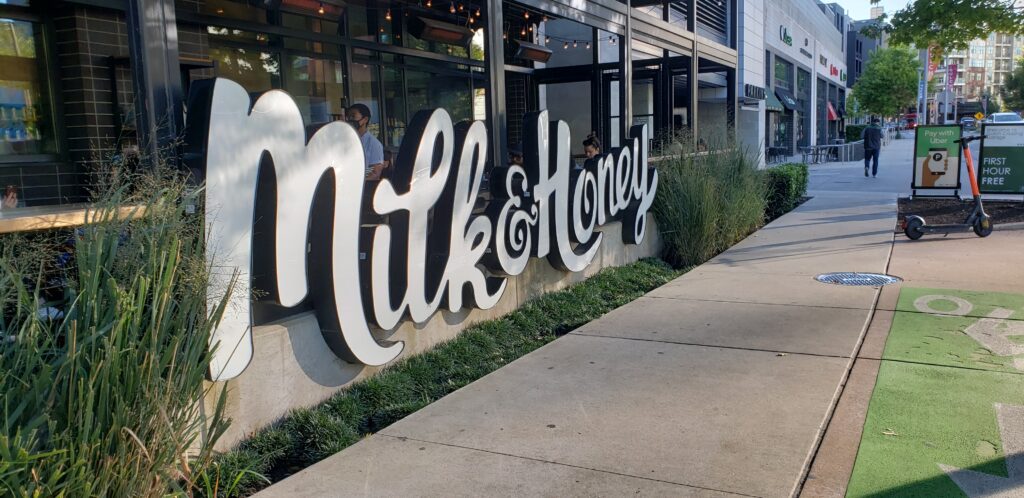 Located in a walking neighborhood that Nashville calls the Gulch is a restaurant called Milk & Honey that gives you an upscale modern diner type-of-vibe. This restaurant is a southern sophisticated diner that offers a dining experience, bakery and coffee shop—all in one. It has both indoor and outdoor seating. Which is always a plus for me. I love a good patio where I can enjoy a drink and a meal.